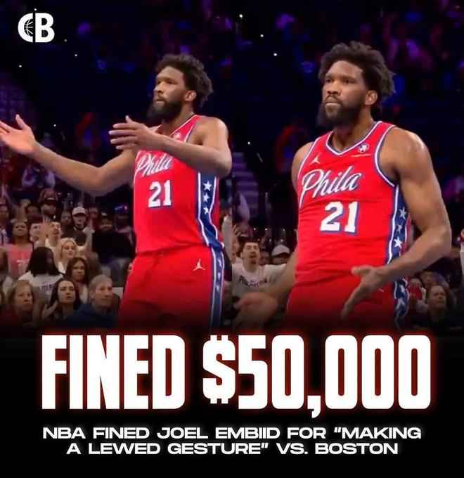 今天,NBA官方宣布, 恩比德因不雅庆祝动作,被联盟罚款5万美元。